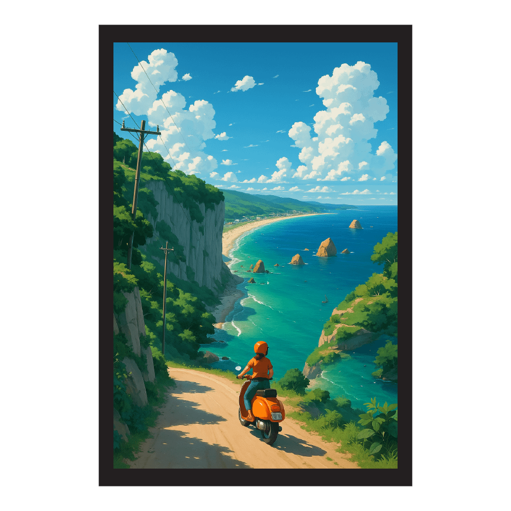 This captivating art print captures the freedom of the open road and the serenity of the sea. A lone rider on a bright orange scooter winds down a sunlit coastal path, overlooking turquoise waters and golden beaches that stretch to the horizon. The lush greenery, towering cliffs, and endless sky dotted with billowing clouds create a dreamlike atmosphere of wanderlust and possibility. Perfect for travel lovers, coastal dreamers, and anyone who craves the call of adventure. Printed with vivid, long-lasting colors to bring the beauty of the journey into your home.