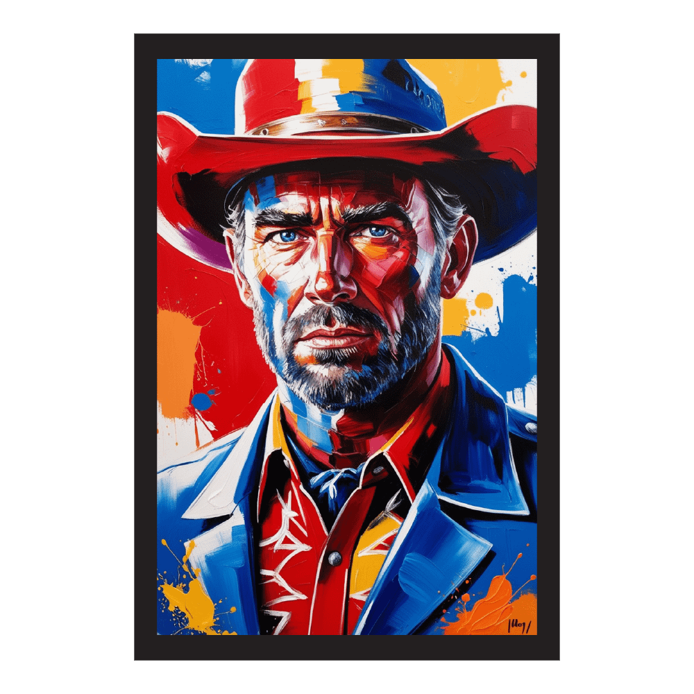 Bold, fearless, and impossible to ignore, Technicolor Cowboy captures the rugged spirit of the Wild West in an explosion of modern color. This striking portrait blends classic cowboy grit with vibrant, abstract brushwork in fiery reds, deep blues, and golden yellows. The result is a powerful statement piece that bridges tradition and contemporary art, perfect for those who crave a touch of rebellion in their space.